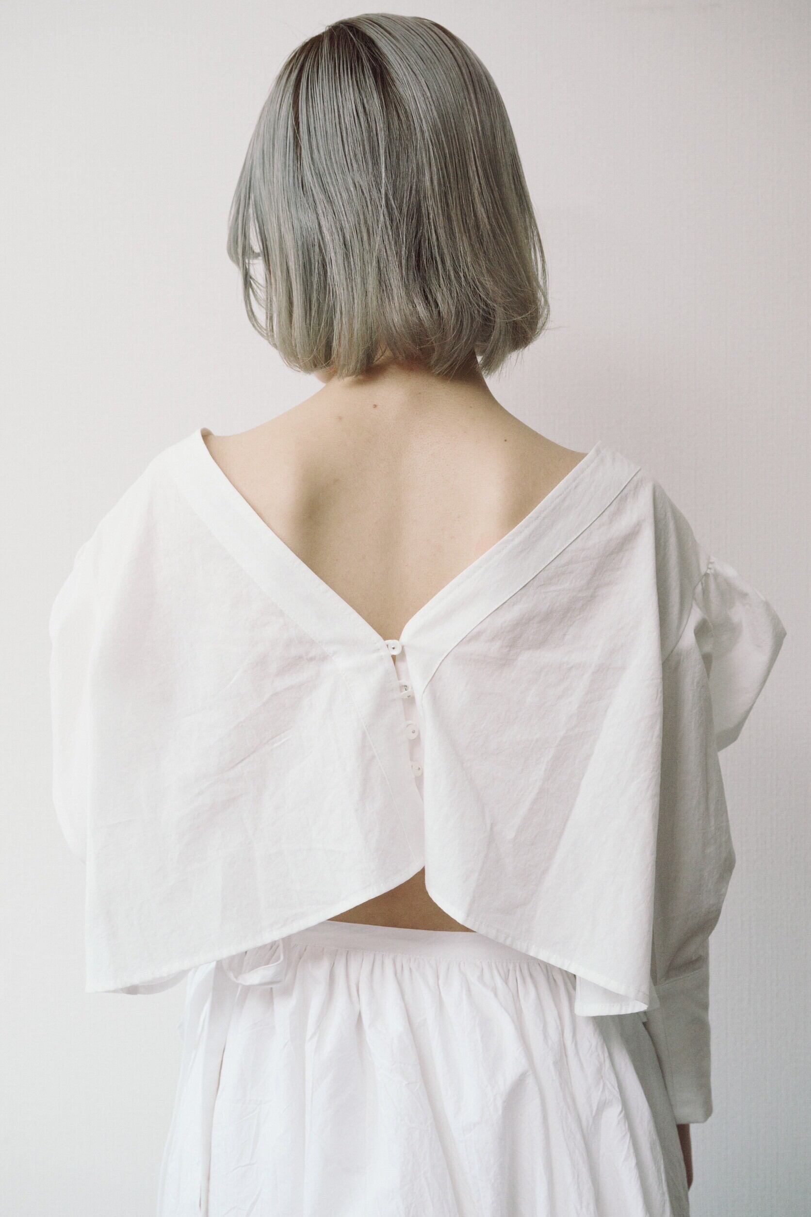 いつぞの昔を彷彿させるようなドロップパフショルダーのブラウス。 フロントが深く開いており短丈でいてワイドな身幅でなんといってもコットンの軽さが見事に融合し、クールな側面と女性らしい表情をお楽しみいただけます。 Tシャツやタートルなどと重ねて。 Cotton 100% サイズfree 着丈 44cm 身幅 54cm 袖丈 50cm