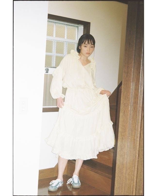 トップはボタンを外し、ネックラインのフリルは後ろに流し。