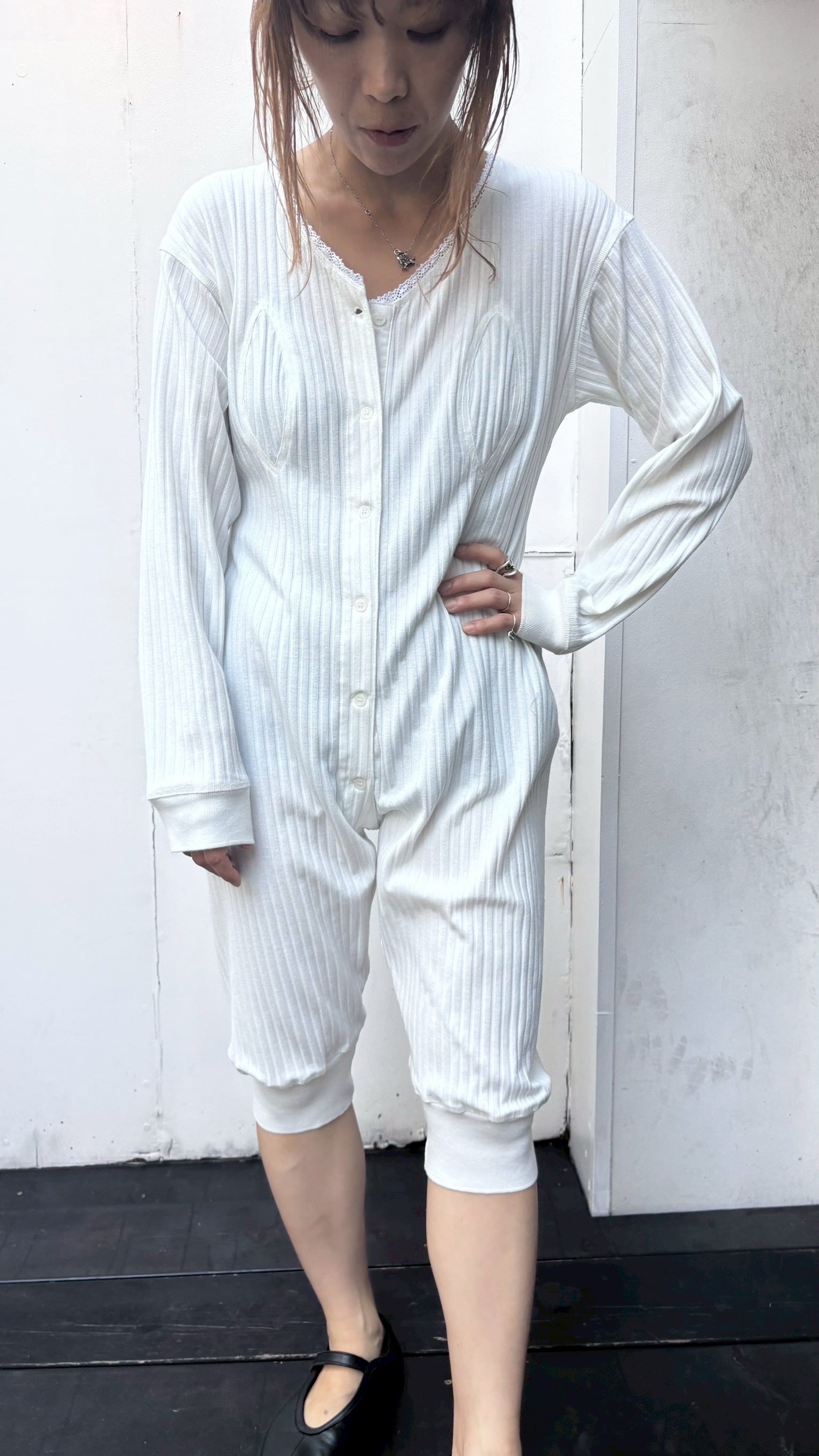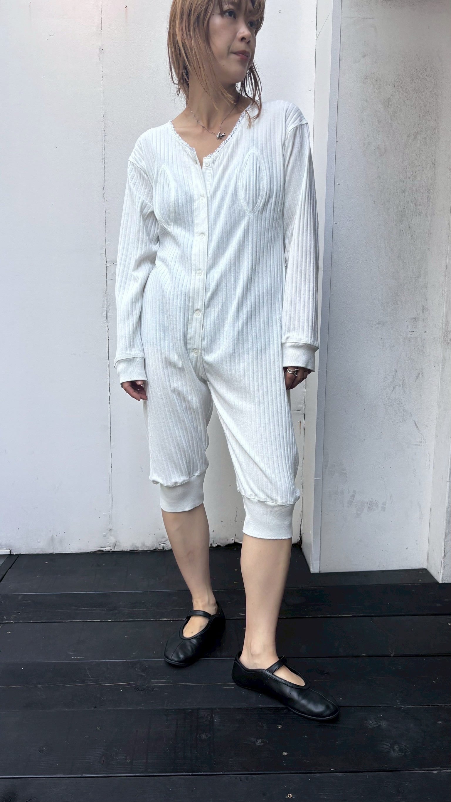 ロンパースをフルレングスパンツではなくあえてのバイカーレングスに。