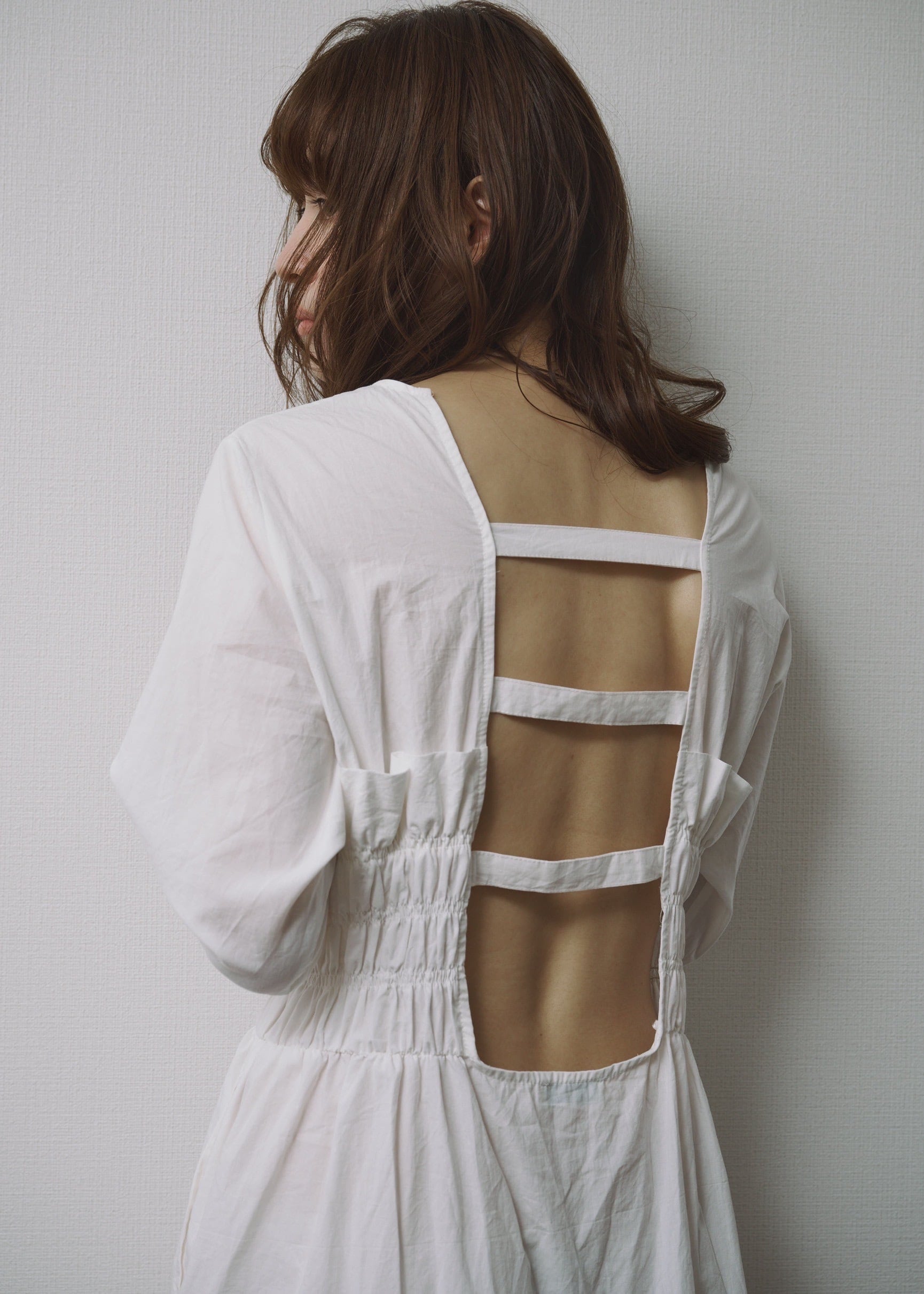 まず、そのバックスタイルのデザインの魅力、フロントのたっぷりギャザーに惹かれるはずのこのワンピース。