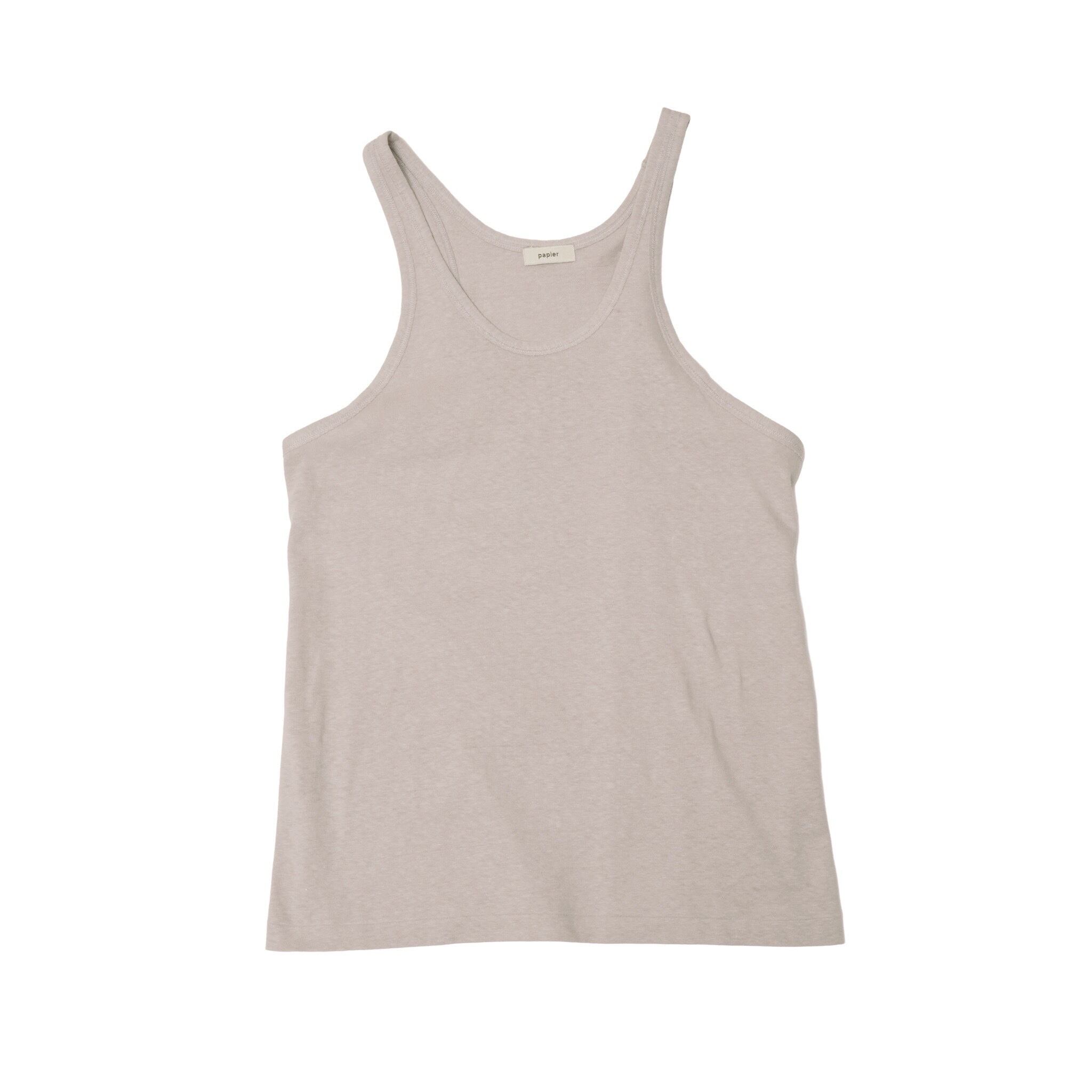 ショーツはコンパクトなトランクスのような位置付けをしており、タンクは着古した雰囲気そして絶妙な肩幅、着丈、胸の開きを構成させた。