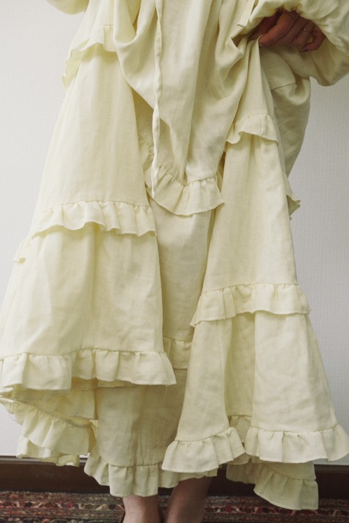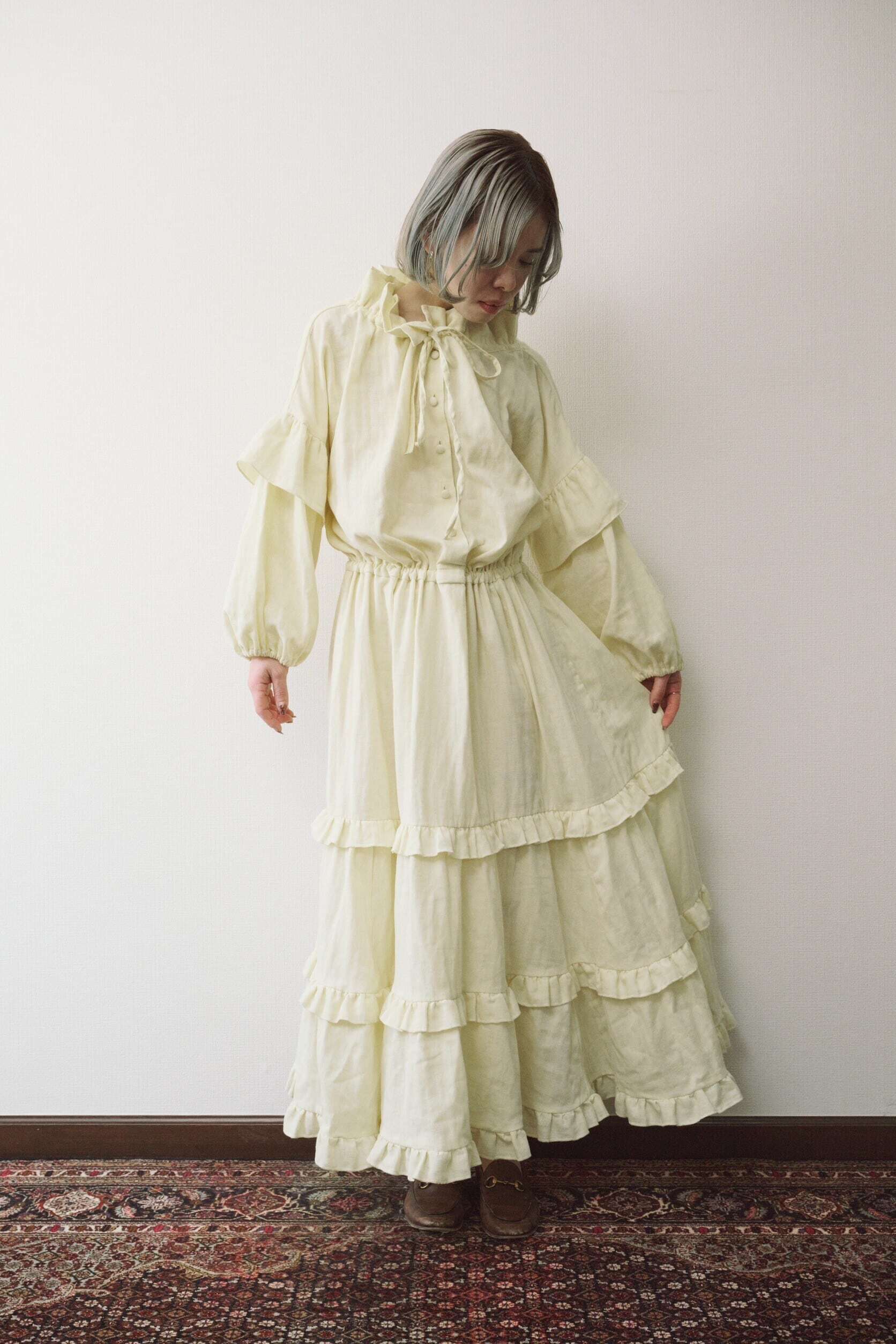 国産のダブルガーゼで要尺7メートルにも及んだウエスト絞りのワンピースです。