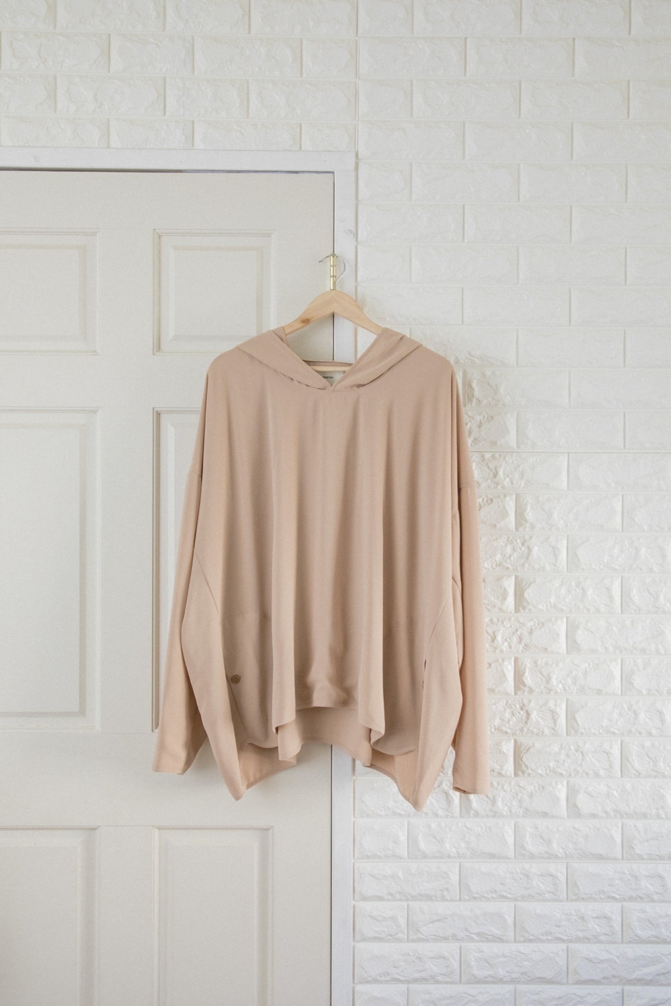 流れるような生地の落ち感をダブル遣いで叶えた新鮮な生地感のフーディです。 身幅は広く、また着丈も含め男女問わずにベストシェイプでお楽しみください。 サイドポケットは広く、ボタンでポイントもお楽しみください。 身幅63cm 着丈60cm 袖丈70cm ポリエステル100