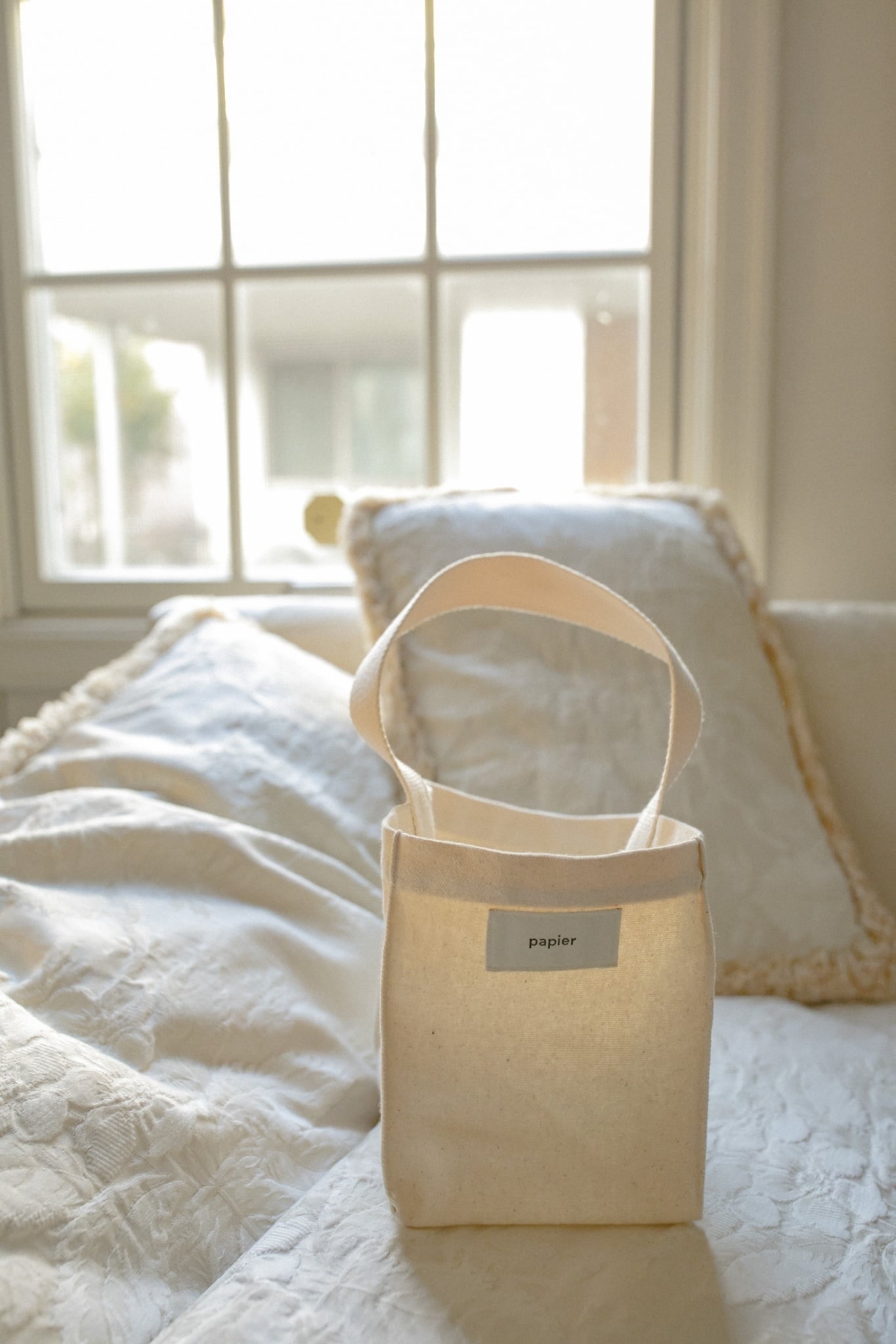 食パンを買ったはいいけれどせっかく焼きたての美しい食パンさんをなるべく綺麗な形で持ち帰りたい。そして一見パンが入っているだなんて思わぬ容姿にさらに魅力が。コットン100papierオリジナルハンドバッグです。