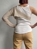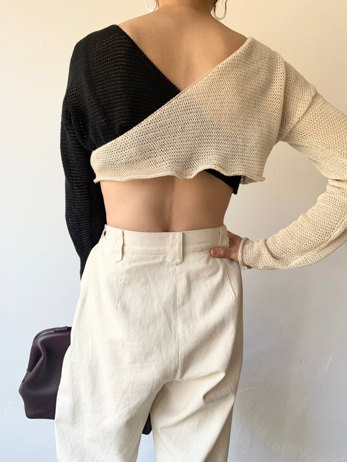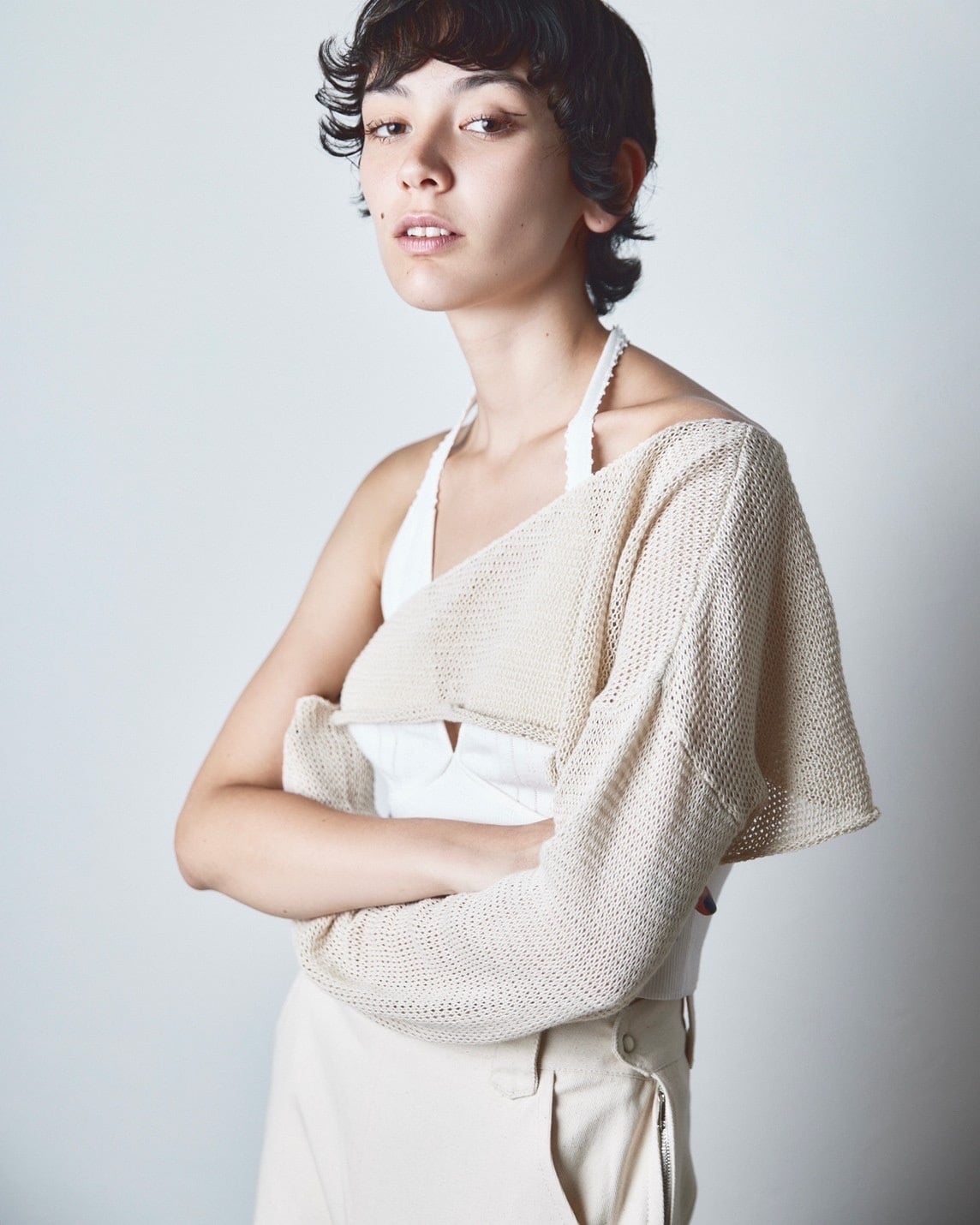 レイヤードがお得意な方、ビギナーの方と幅広く楽しむことのできる片腕のニットトップスです。 ルーズシルエットを活かし、Tシャツデニムのいつものスタンダードスタイリングにこちらをプラスするだけでニュアンスが完成します。 "着る" という概念を最初から持たず、コーディネートの足し算、時には引き算と、駆け引きをお楽しみいただきたいアイテムです。 サイズ FREE 着丈 27cm 身幅 42cm 袖丈 57.5cm 天幅 40.5cm リネン 55% コットン45%
