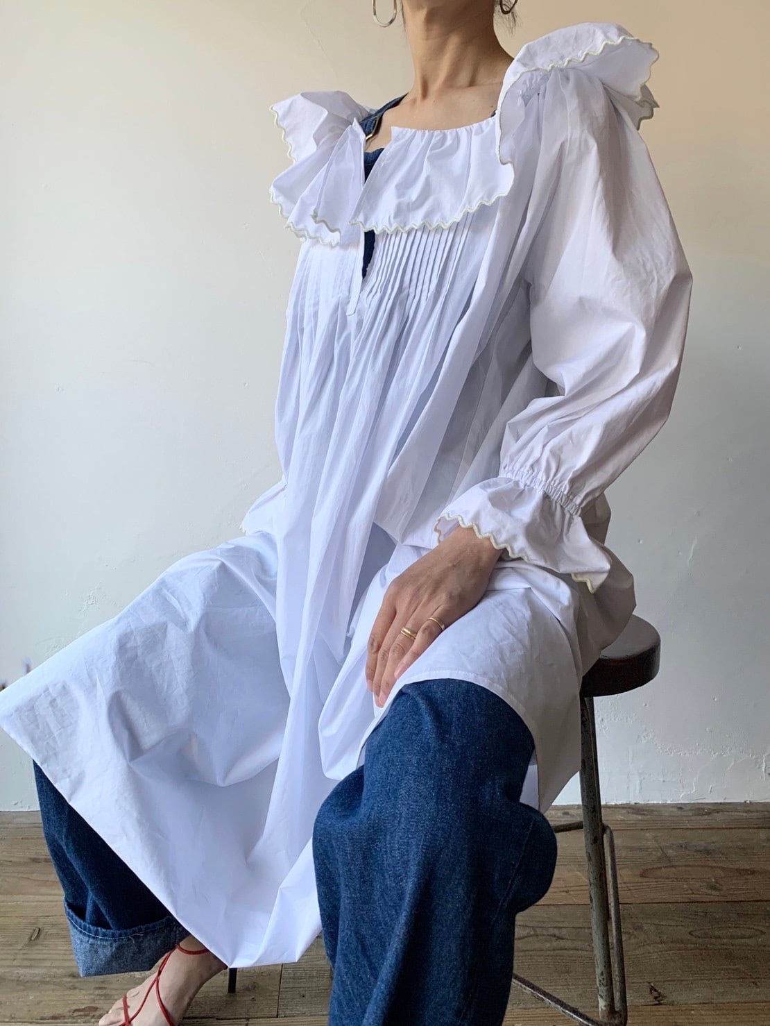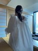 ネグリジェのような優しい雰囲気を持ちながら、首元のフリルを後ろに流したりオフショルにしたりとムードの展開も自在に。