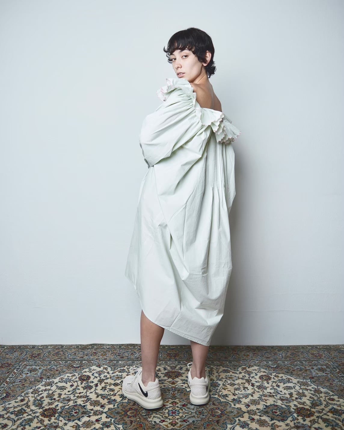 ネグリジェのような優しい雰囲気を持ちながら、首元のフリルを後ろに流したりオフショルにしたりとムードの展開も自在に。
