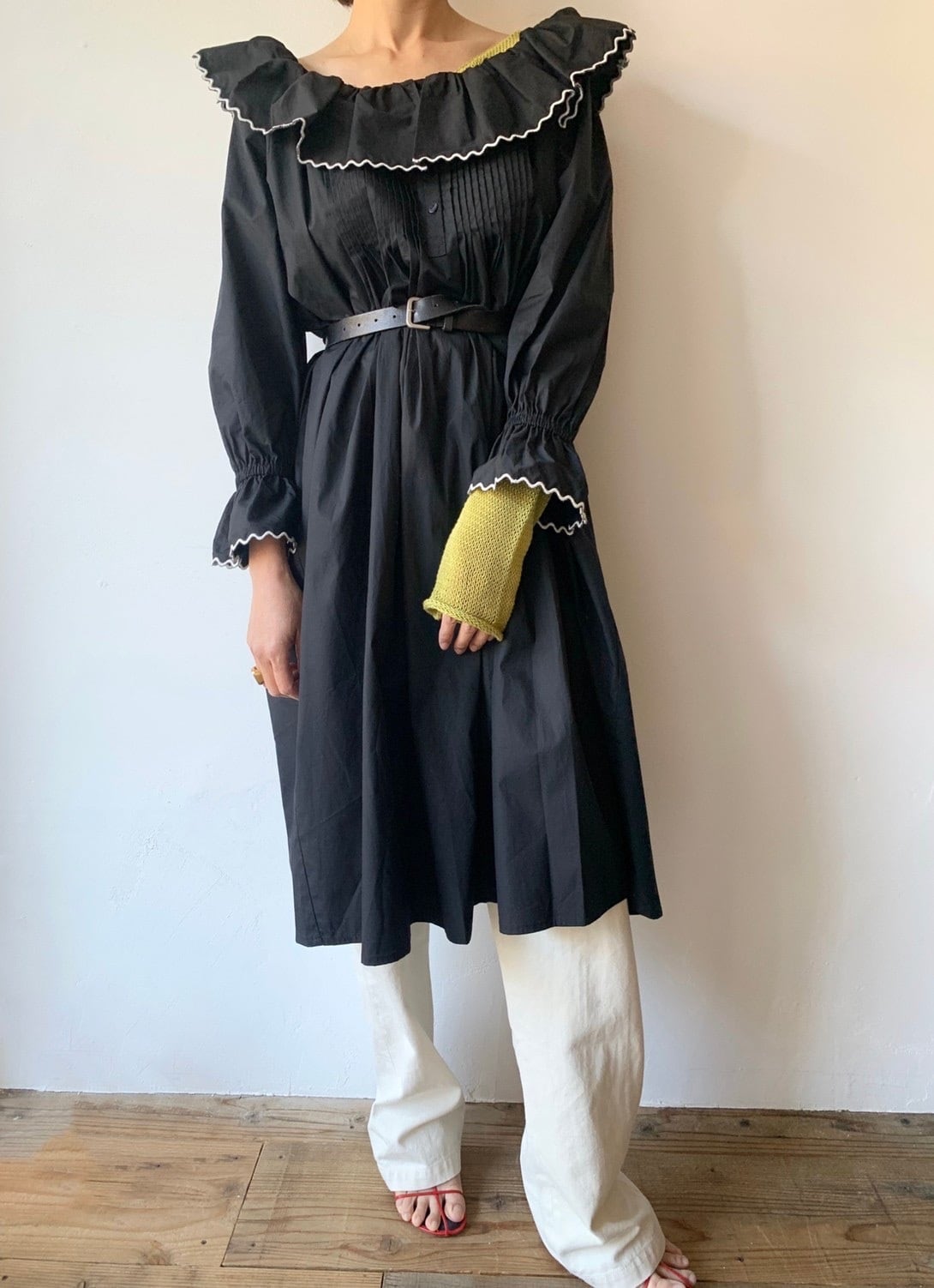 ネグリジェのような優しい雰囲気を持ちながら、首元のフリルを後ろに流したりオフショルにしたりとムードの展開も自在に。