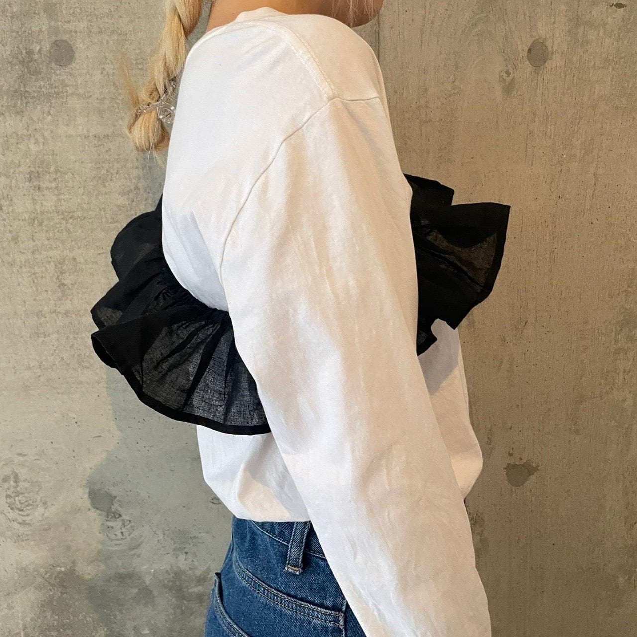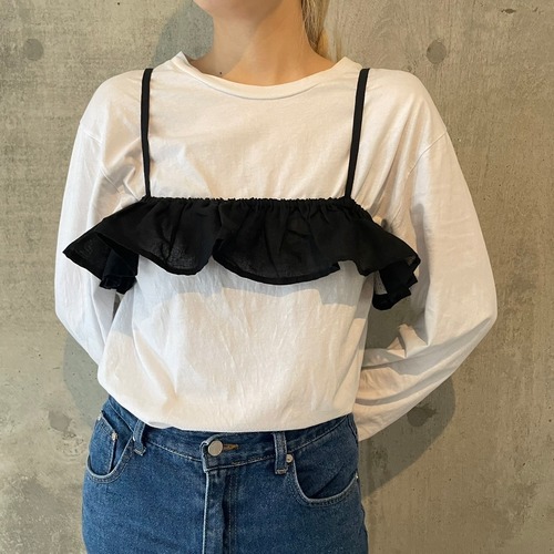 アイテムとしてはブラトップの部類にあたりますが、肩ストラップを抜いたり、腰まで落としてみたり、可愛らしいフリルをどう着るか、という楽しみ方が魅力のpapierならではのアイテムです。
