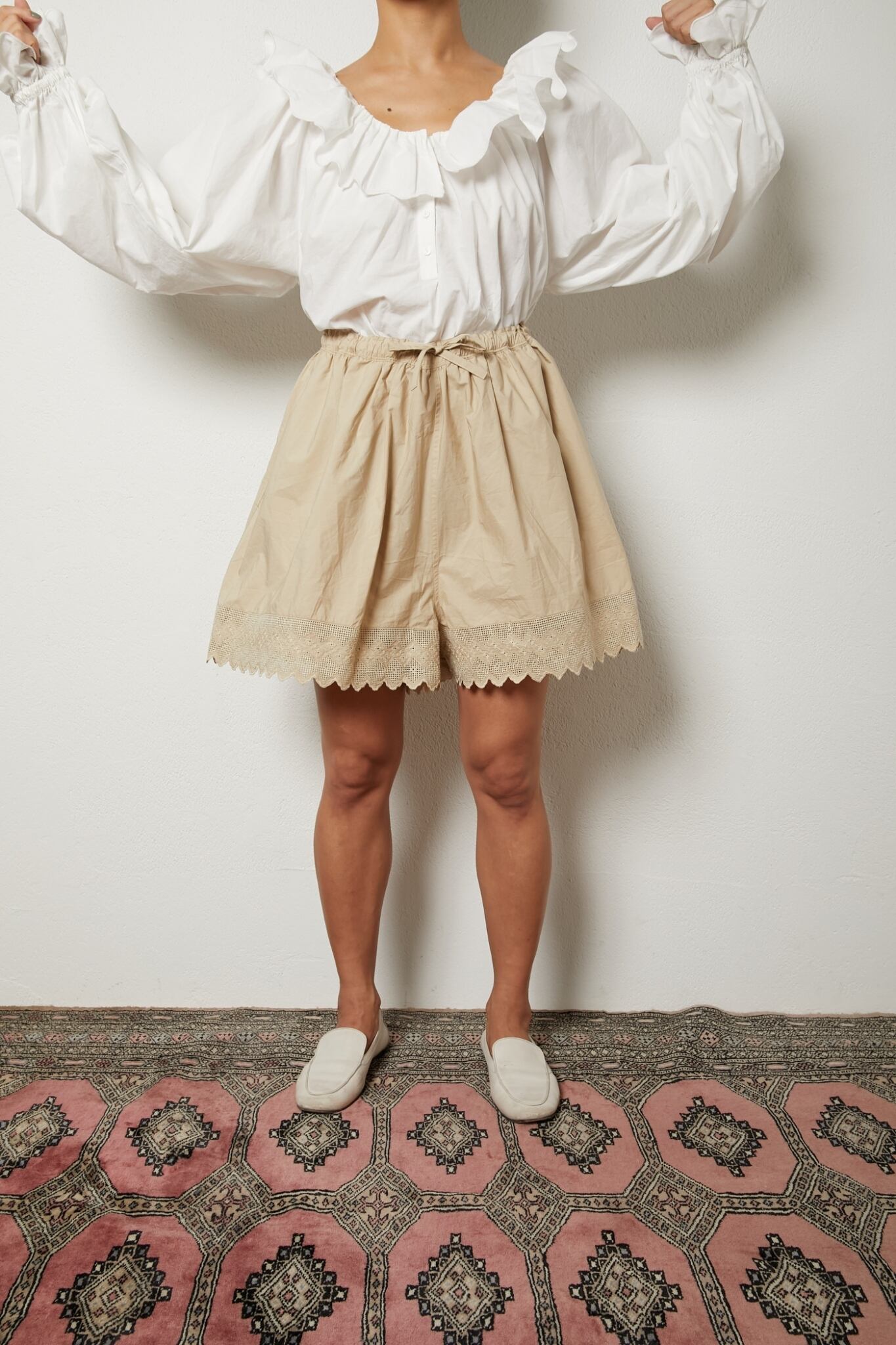レディースではあまり市場でみないような丈感と、ナイロンのようなシャカ感のある風合い、裾の刺繍はスウィートではなく、アンティークのヨーロッパのカーテンやテーブルウェアなどファニチャームードから切り取りました。