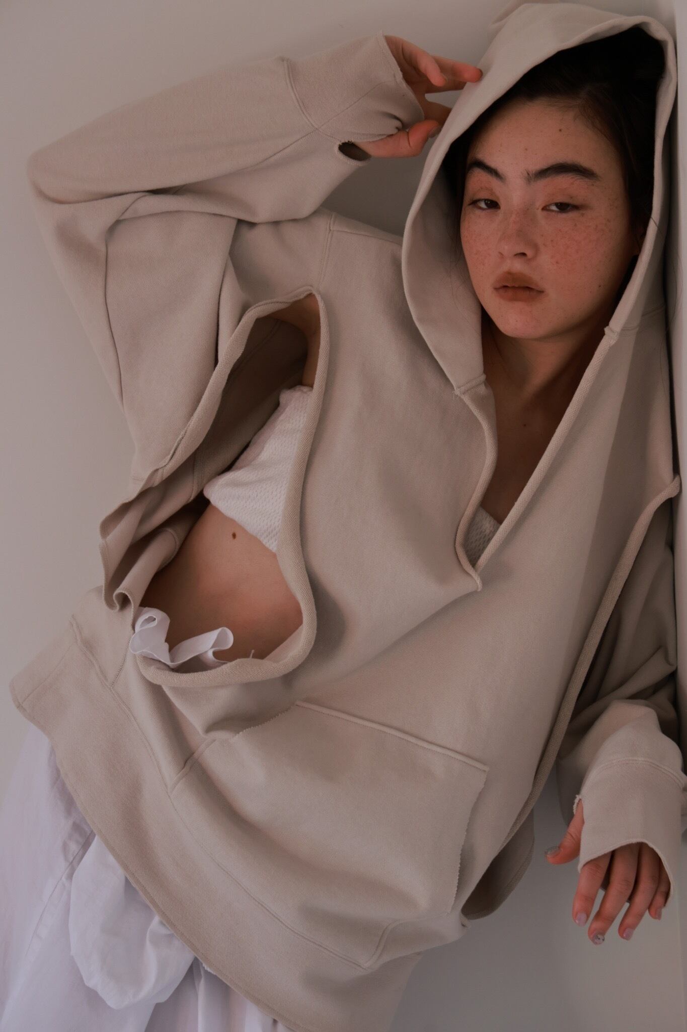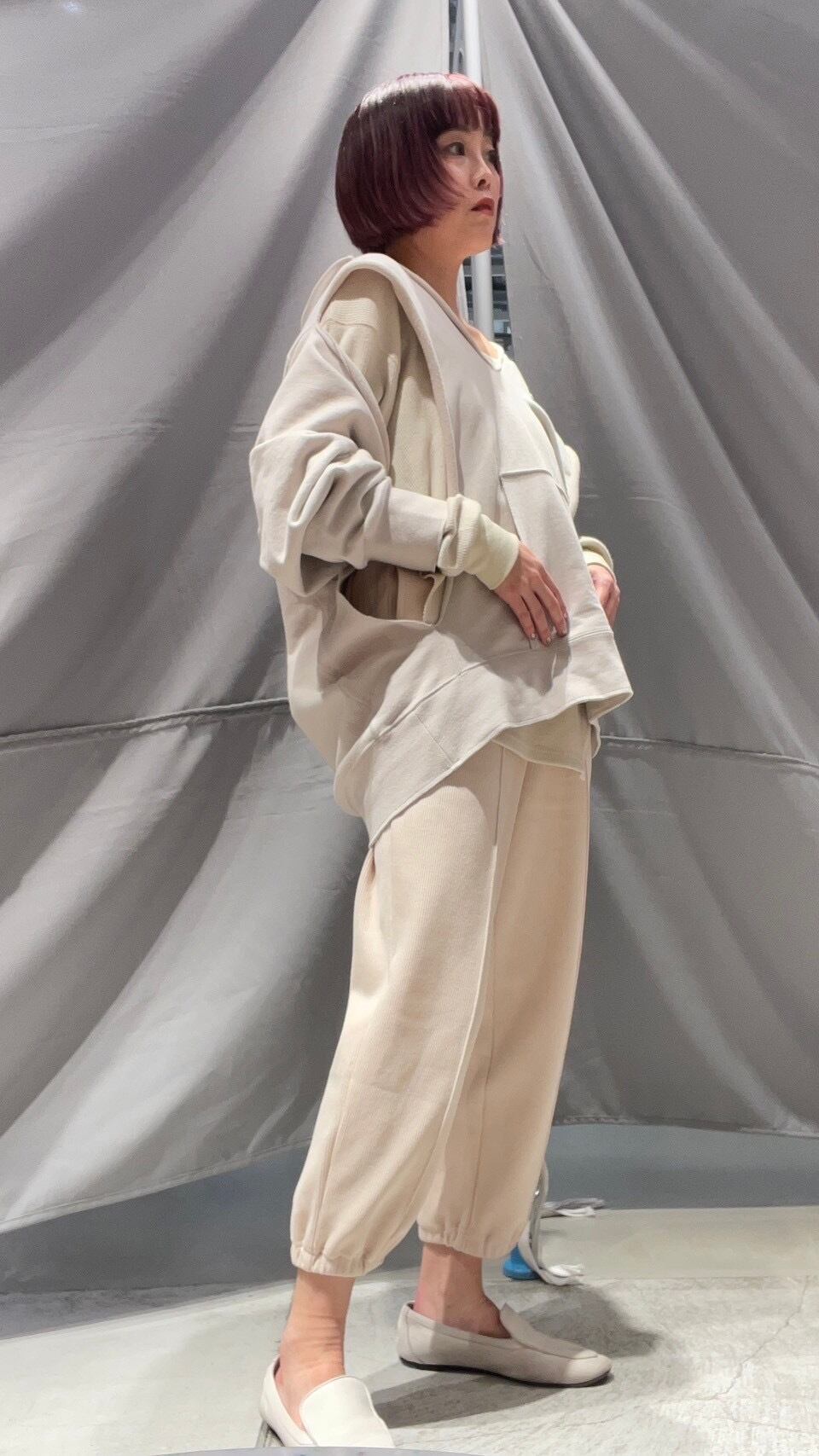 古着のリヴァースウィーブの原理を活かし、生地の織り方を縦と横をその雰囲気を強調したい部分によって使い分け、縮まぬように工夫を織り込んだり、またディレクターのカットワークを生かし大胆にカッティングを。