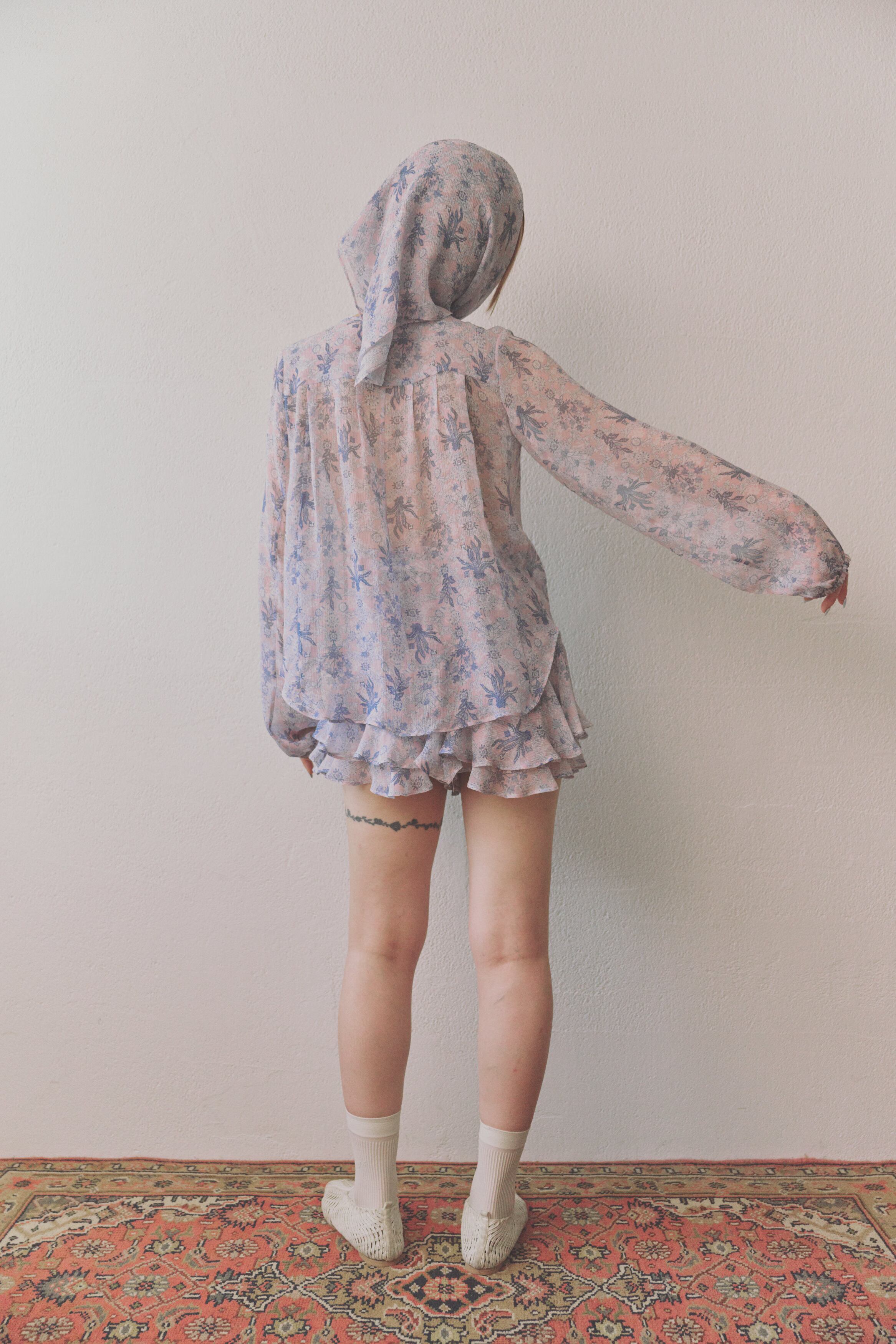 今シーズンの為に描き起こした、 フローラルとエスニックが融合した唯一無二のオリジナル柄。デザイナーの姓、椿原より【椿】のモチーフを落とし込んでいます。